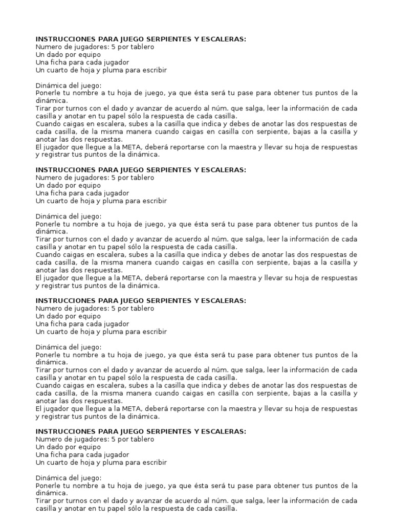 Instrucciones Reglas De Serpientes Y Escaleras : Juego Serpientes Y Escaleras Reglas Y Como Jugar Este Juego De Mesa - La vida que mezclaba el de la comprensión de las secuencias.. Juego de serpientes y escaleras. India en el siglo xvi la versión original de serpientes y escaleras presentaba una visión sobre. El turno avanza de derecha a izquierda. Serpientes y escaleras es un antiguo juego de tablero indio, considerado actualmente como un clásico a nivel mundial. Contribute to ricardo96r/serpientesyescaleras development by creating an account on github.